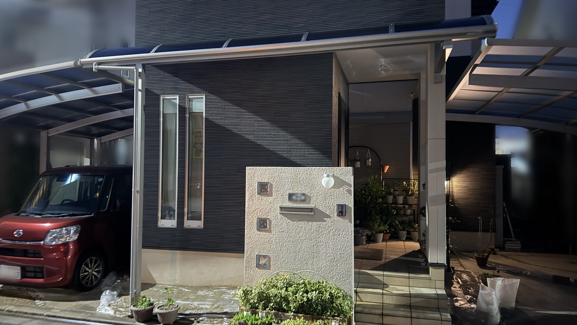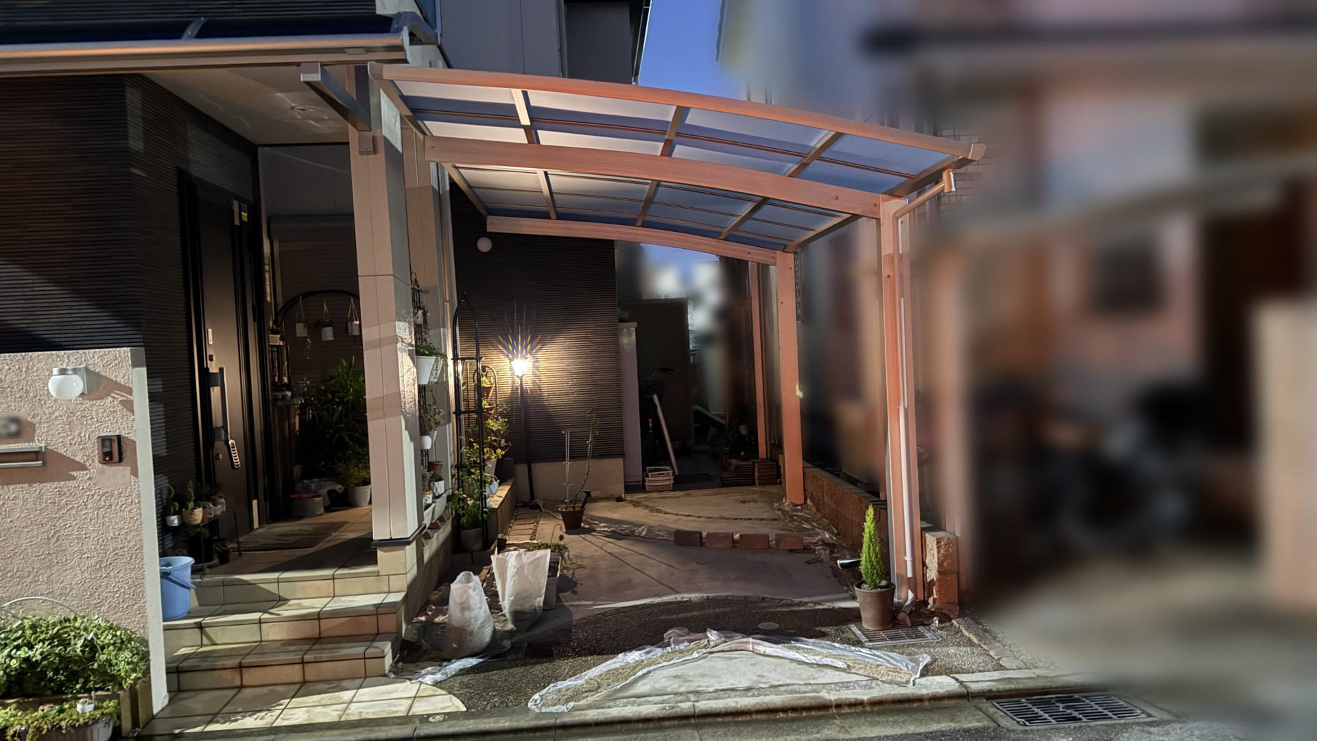 門まわりにテラス屋根を設置、また植栽・土を撤去し、洗い出しを行いました。