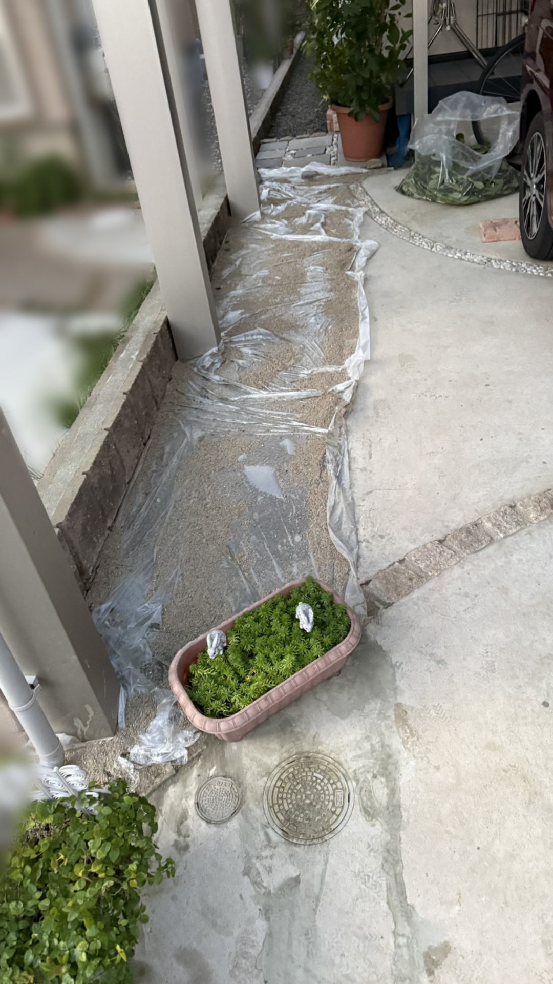 カーポート設置でお車を雨や鳥の糞などの飛来物から守り、紫外線からのお車の塗装の色褪せ、車内シートの日焼けを軽減します。また一部タマリュウや植栽を撤去し、土を撤去して砂美石の洗い出しを行いました。