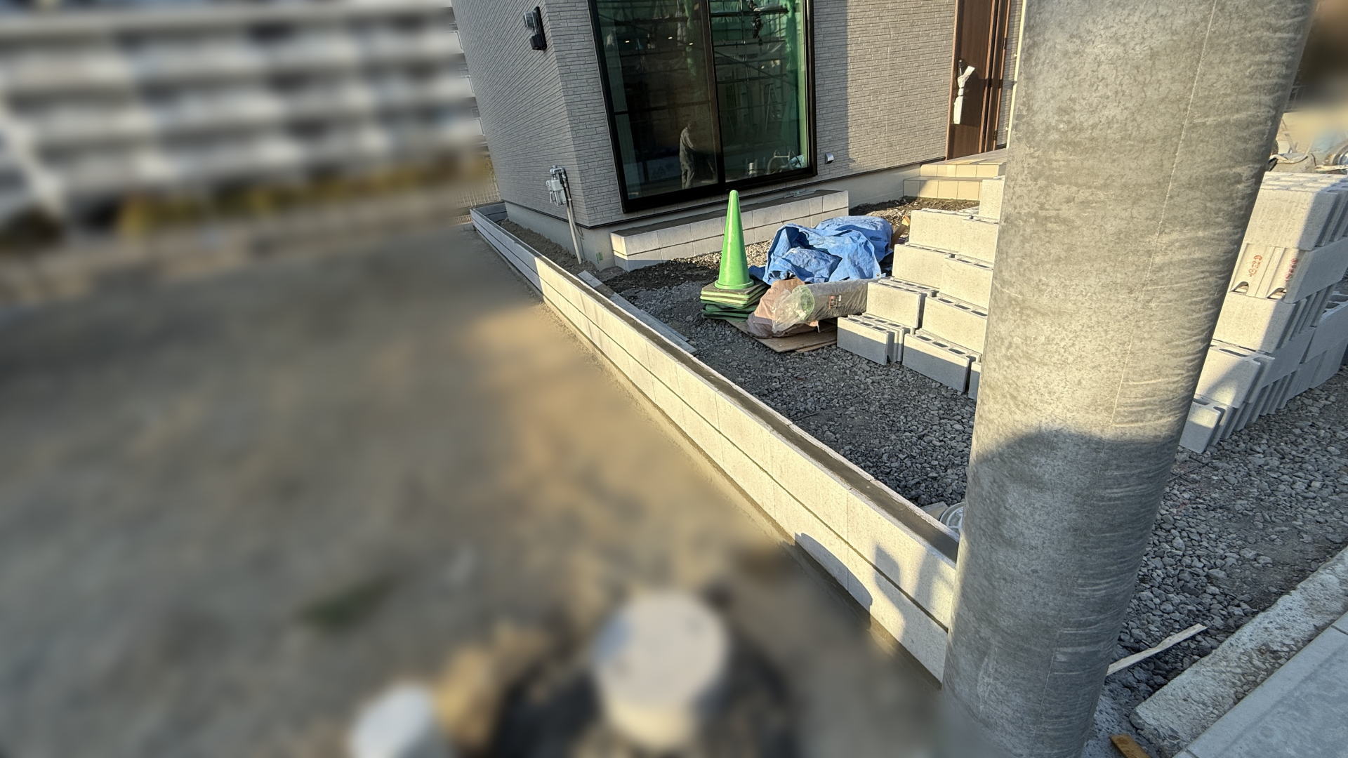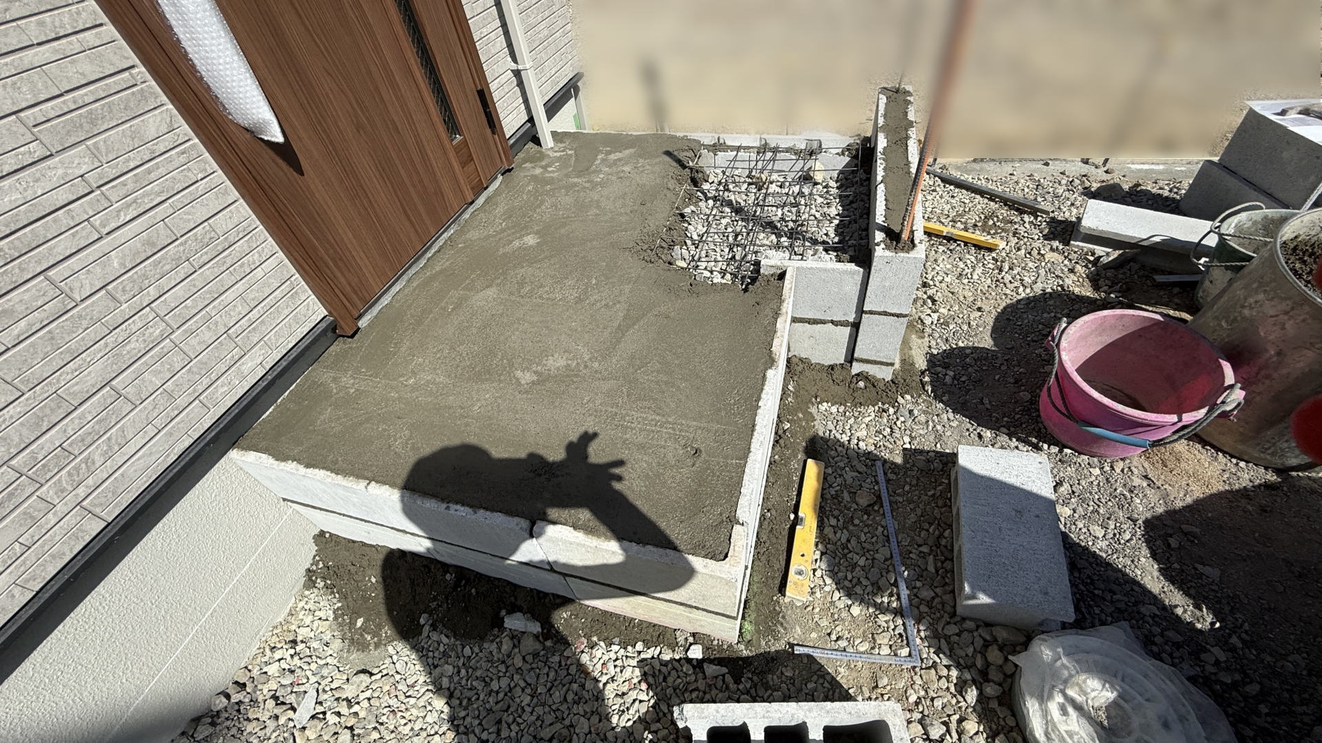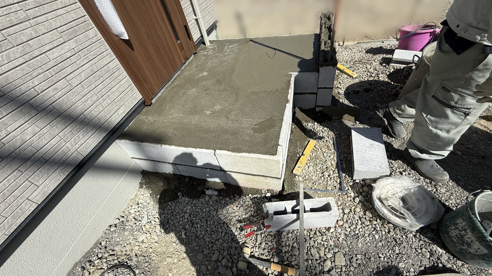 掃き出し窓前の踏み台の下地工事としてブロックを積みました。