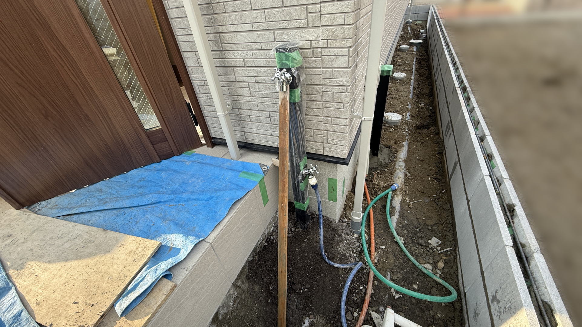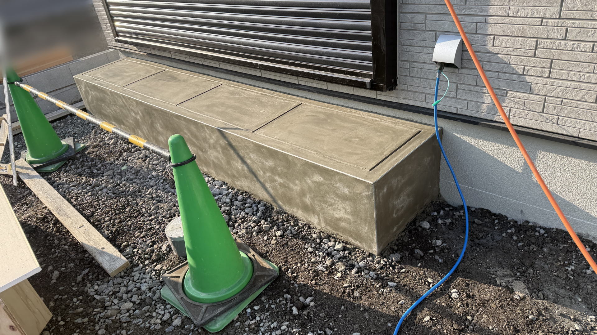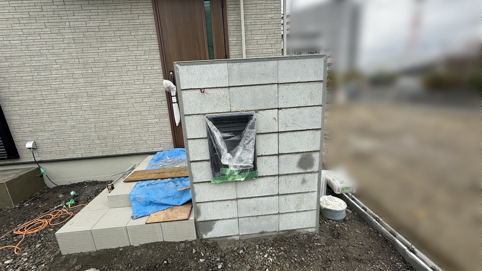 掃き出し窓前の踏み台の下地工事としてブロックを積みました。