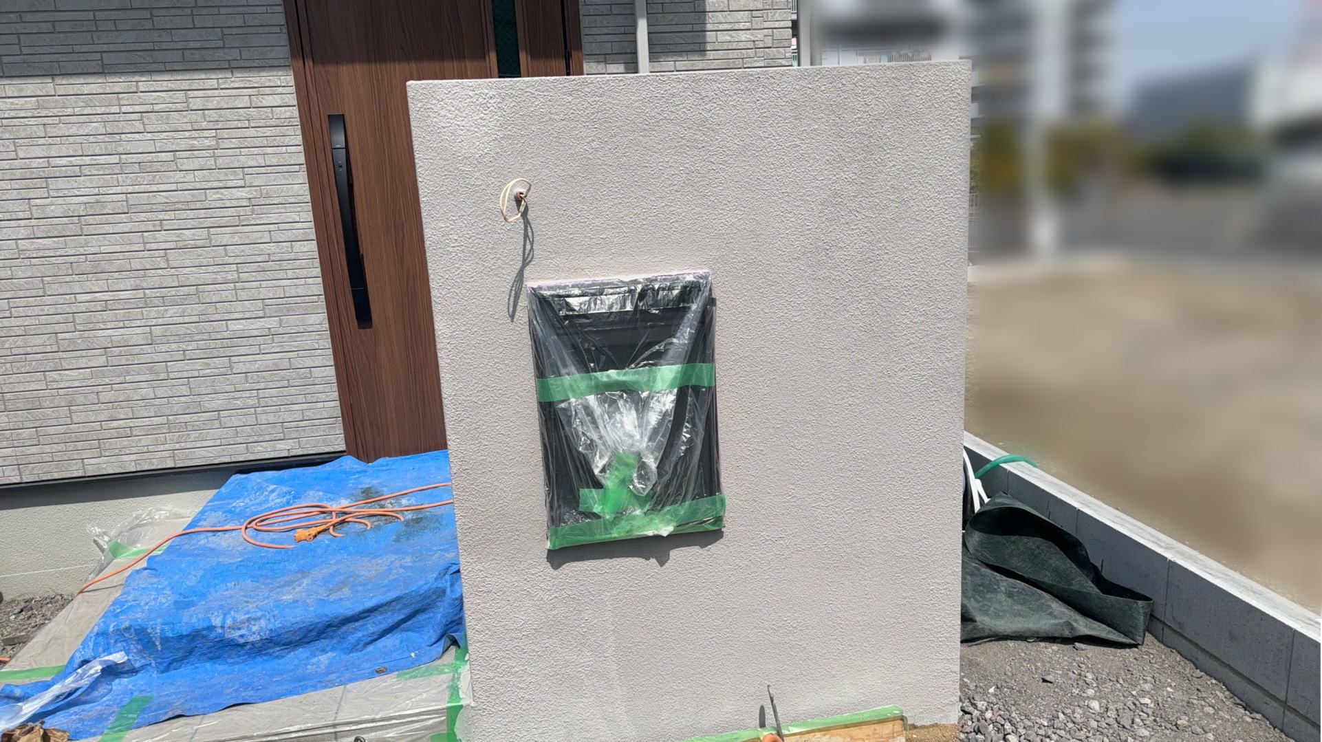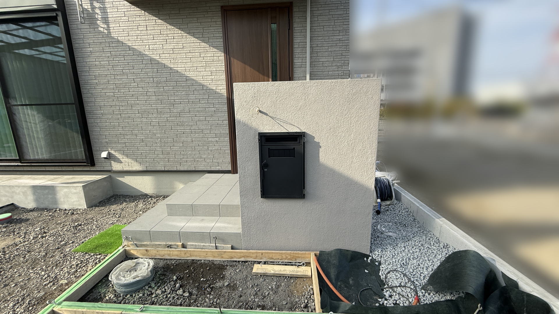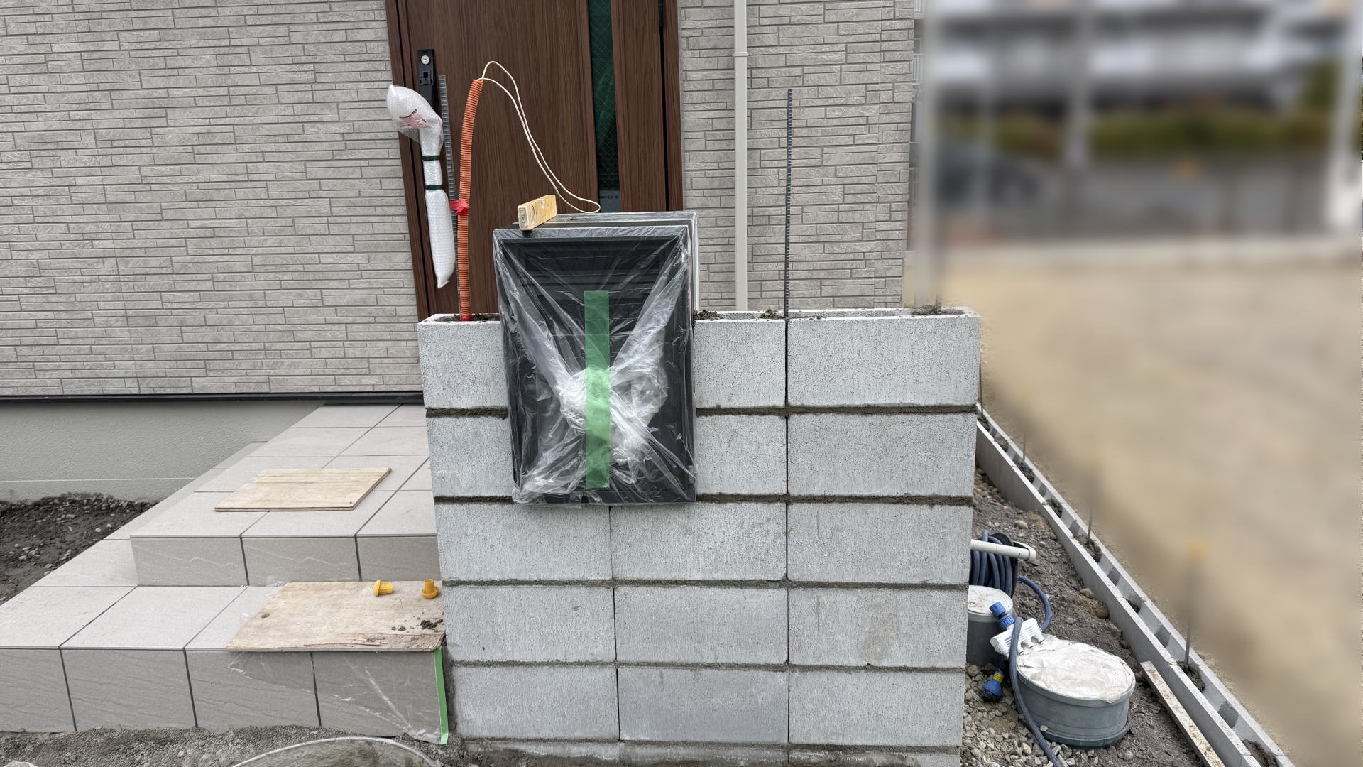 門柱の下地ブロックを積み宅配ボックスを設置しました。宅配ボックスの外扉は後日設置します。