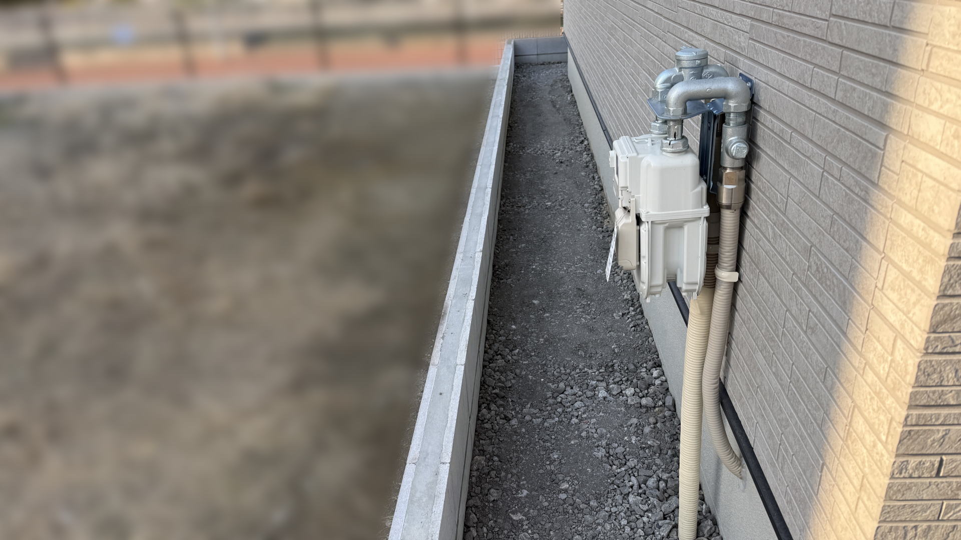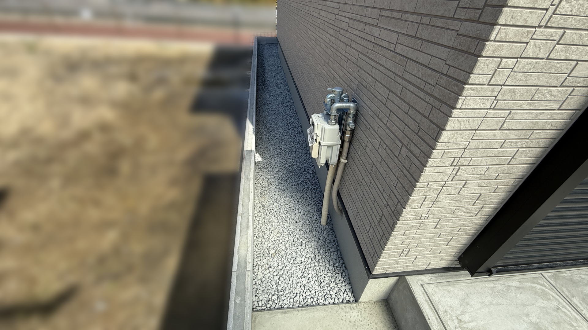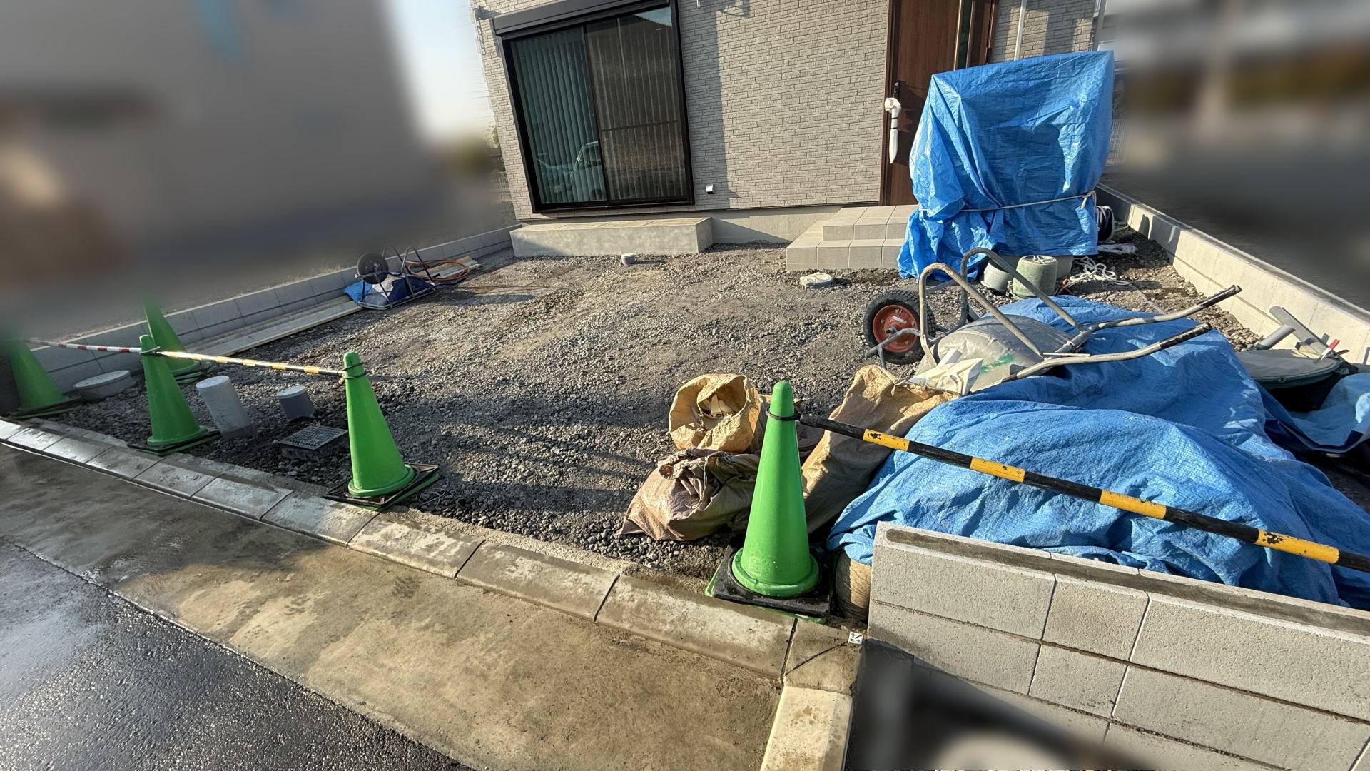 敷地外周にはコンクリートブロックを積み、建物周囲には防草シートと砕石を施工することで、雑草の発生を抑え、メンテナンス性にも優れた外構としました。
