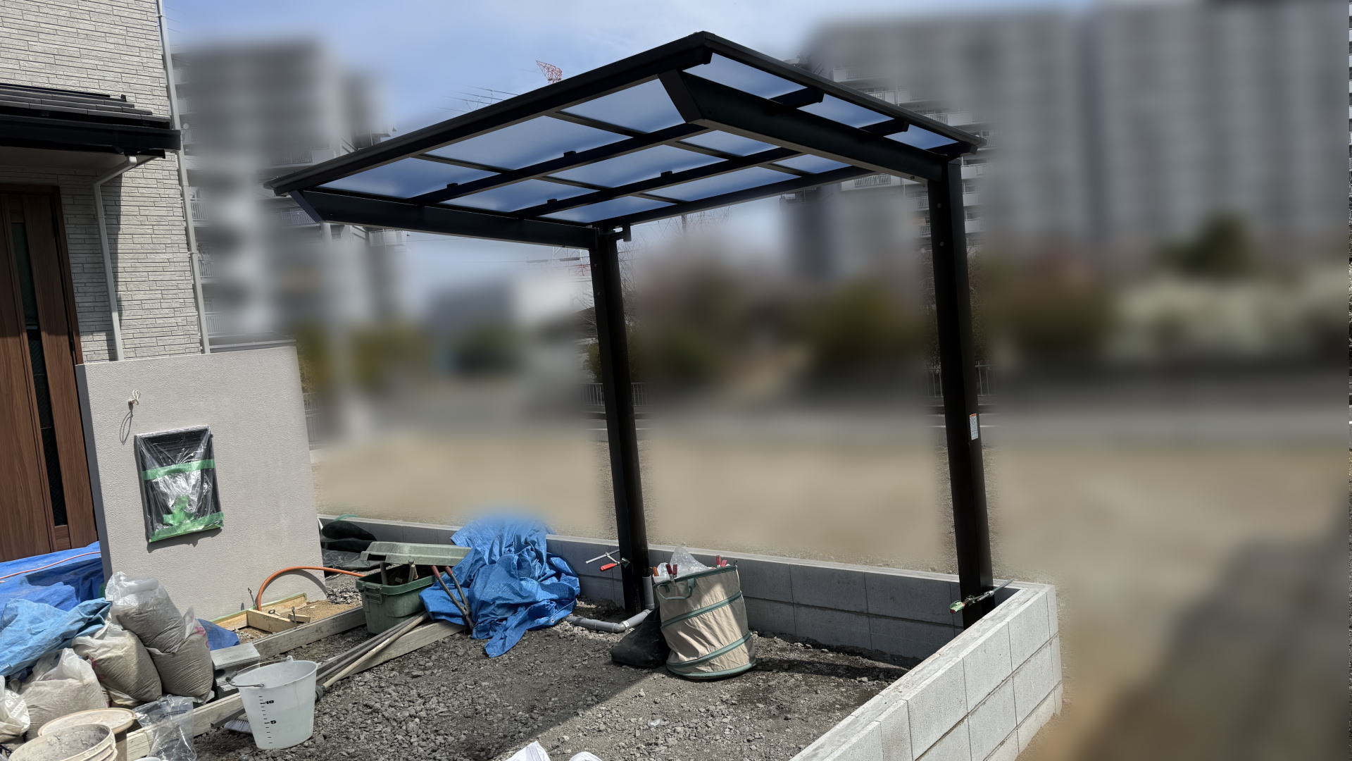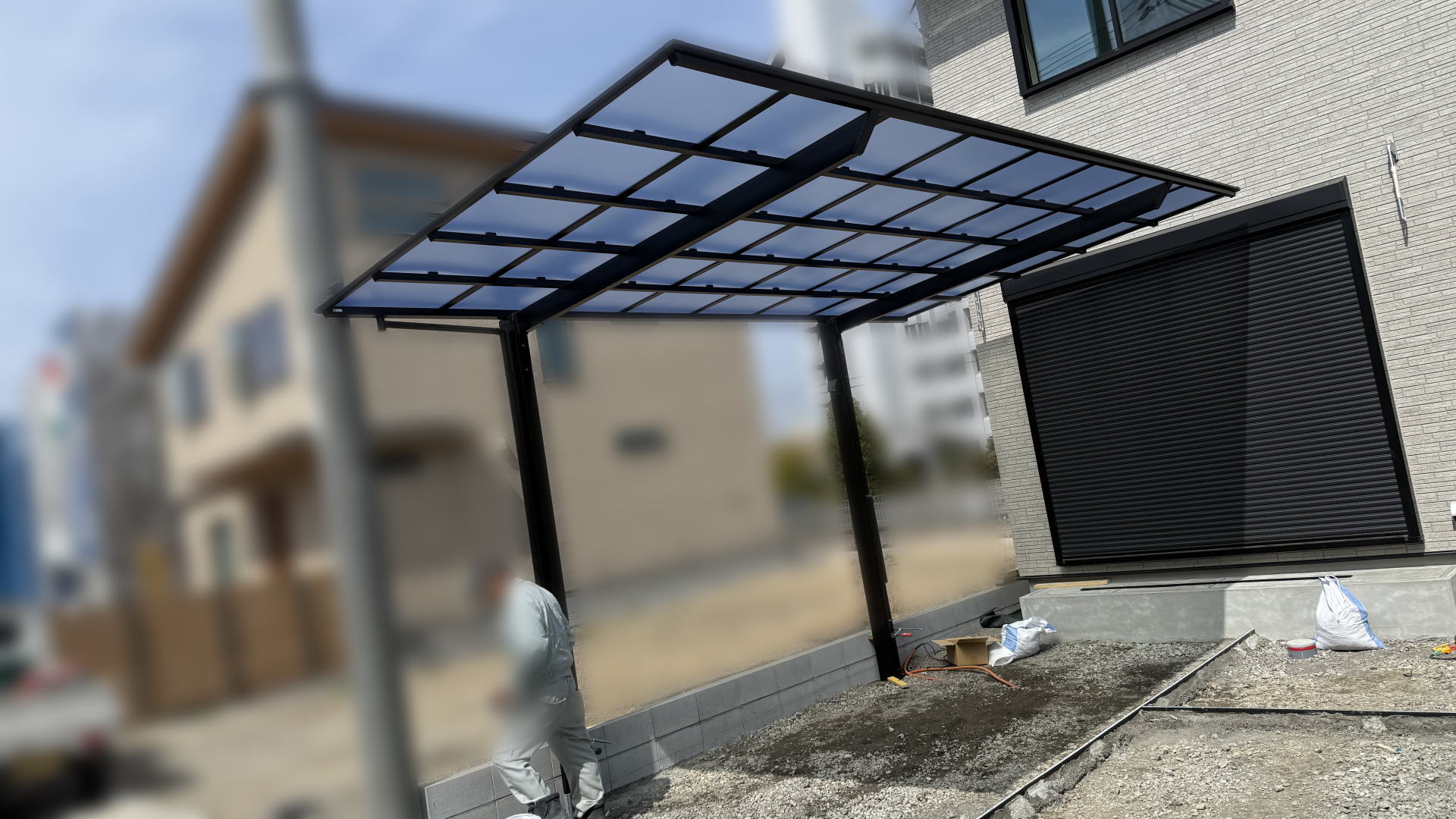 枚方市F様邸 アプローチ・自転車置き場 スリット 防草シート+砂利入れ枚方市F様邸 自転車置き場LIXIL ネスカFミニ18-22型/ブラック 熱線吸収ポリカ/クリアマットS