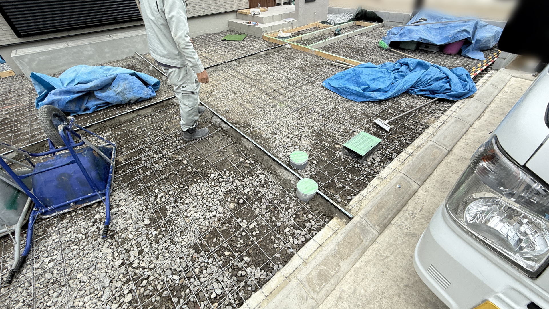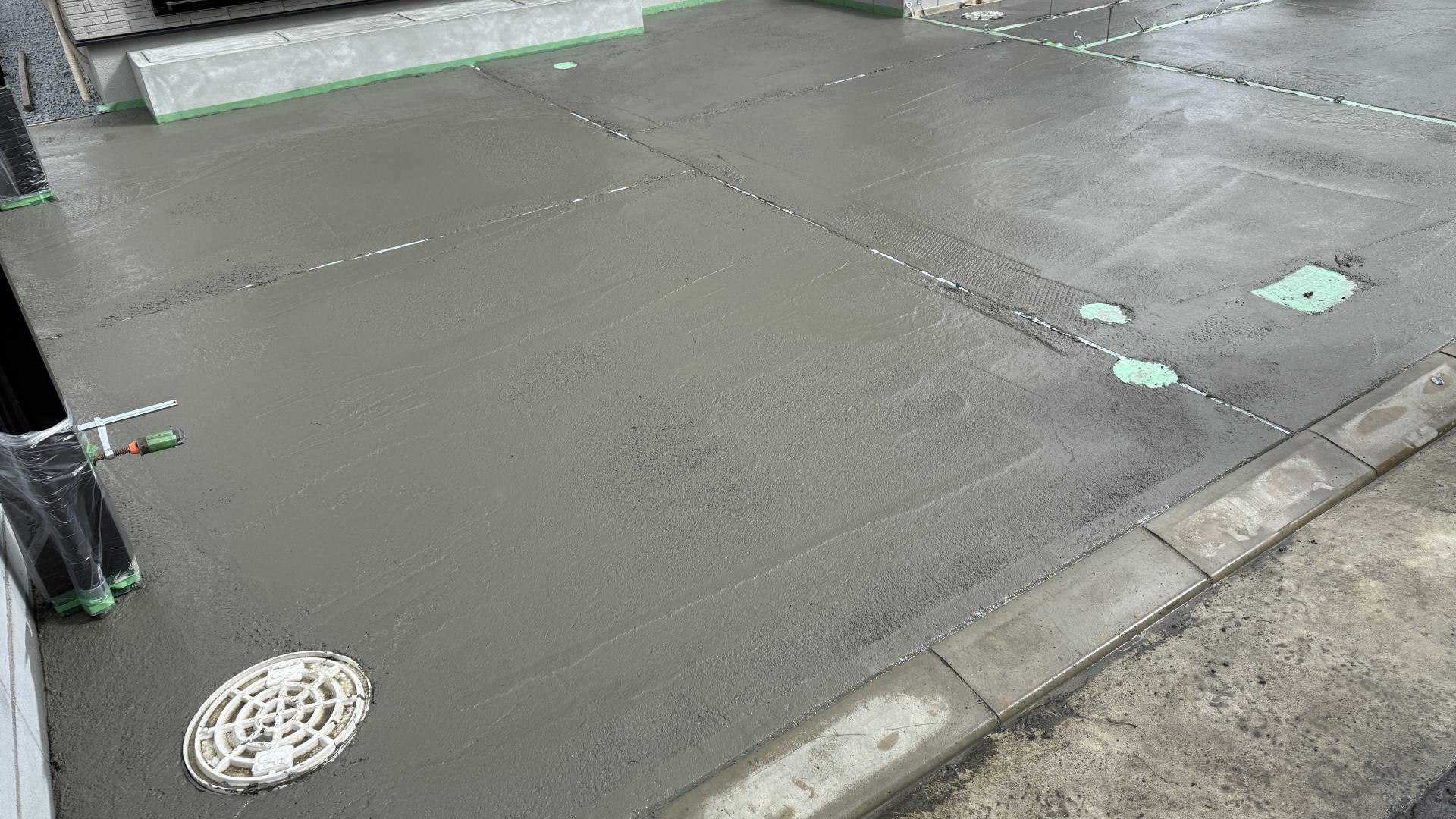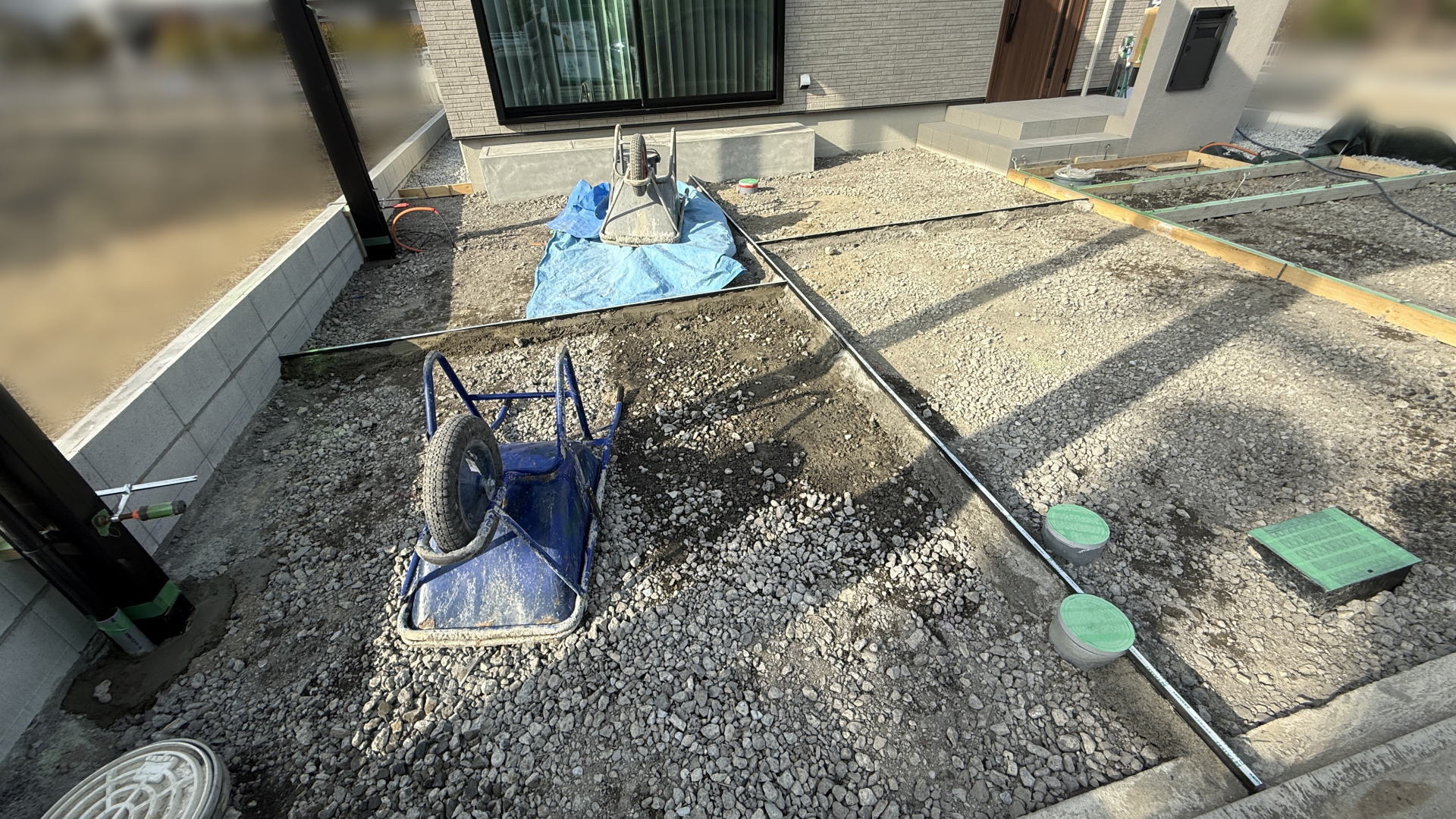 枚方市F様邸 アプローチ・カースペース・自転車置き場 土間コンクリート打設枚方市F様邸 アプローチ・カースペース・自転車置き場 土間コンクリート金コテ仕上げ