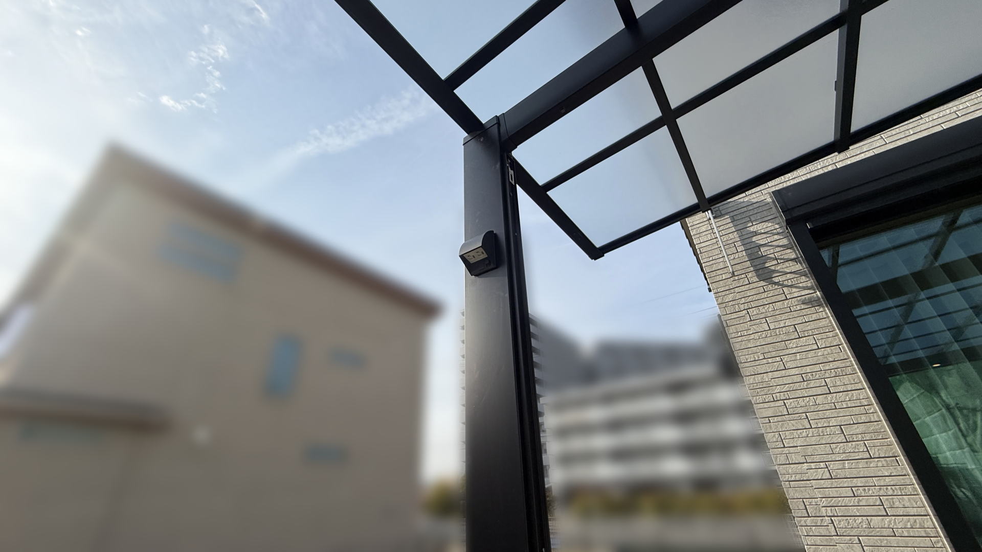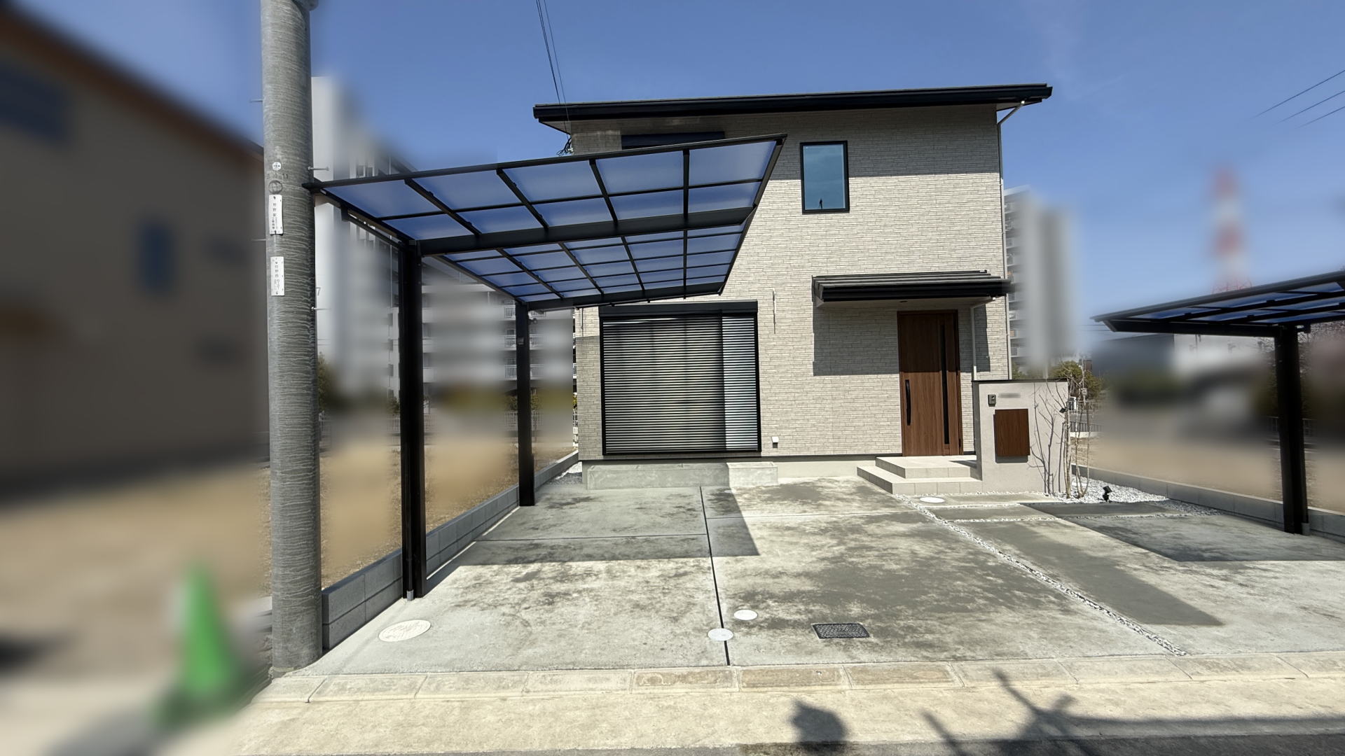枚方市F様邸 カースペース LIXIL ネスカF30-54型/ブラック 熱線吸収ポリカ/クリアマットS H28柱仕様枚方市F様邸 カースペース カーポート柱 コンセント設置