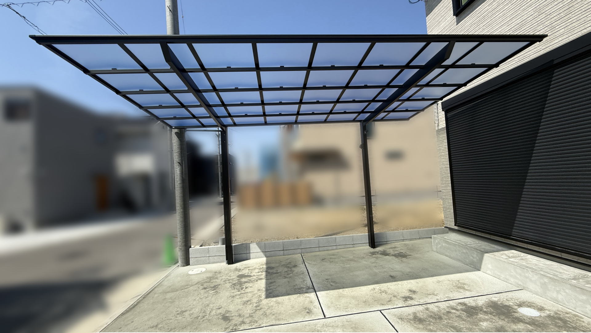 枚方市F様邸 カースペース LIXIL ネスカF30-54型/ブラック 熱線吸収ポリカ/クリアマットS H28柱仕様 土間コンクリート金コテ仕上げ枚方市F様邸 カースペース LIXIL ネスカF30-54型/ブラック 熱線吸収ポリカ/クリアマットS H28柱仕様