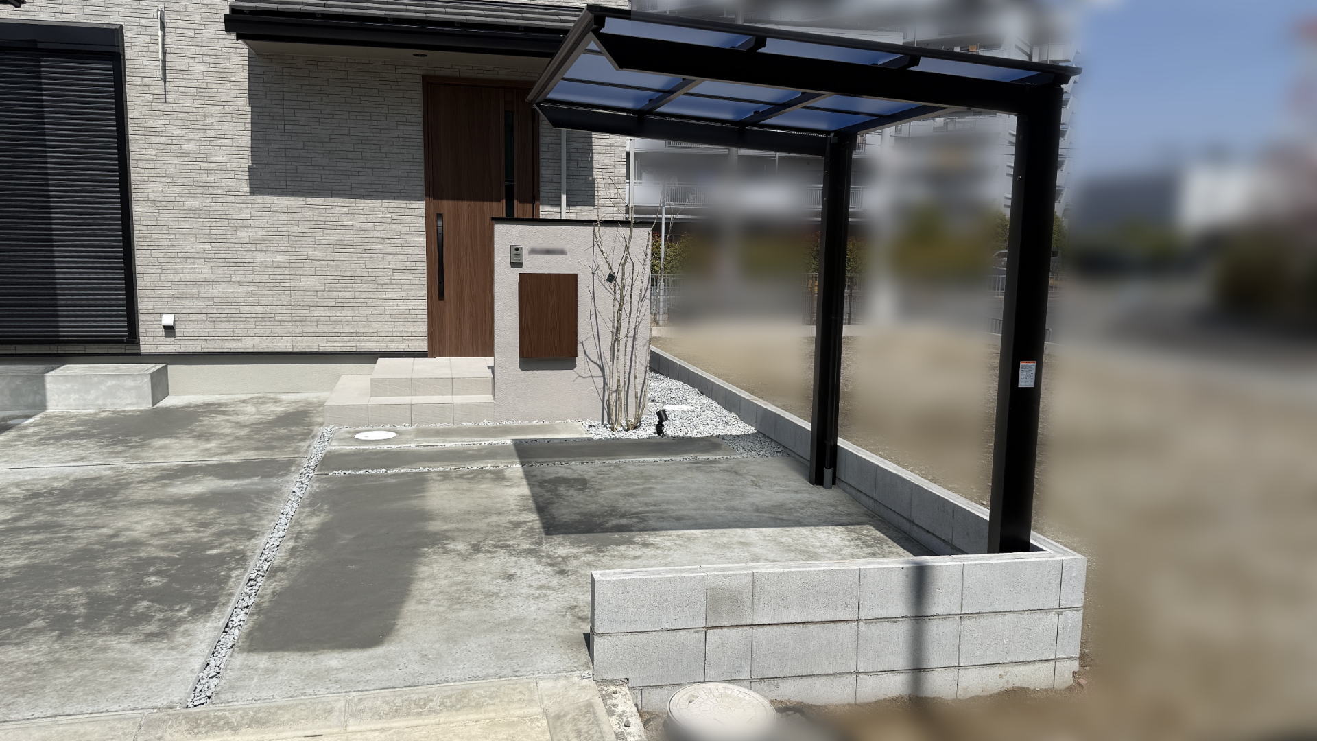 門柱に表札を設置し、植木を移植、土間コンクリートのスリットに防草シートを敷いて砕石を敷きました。