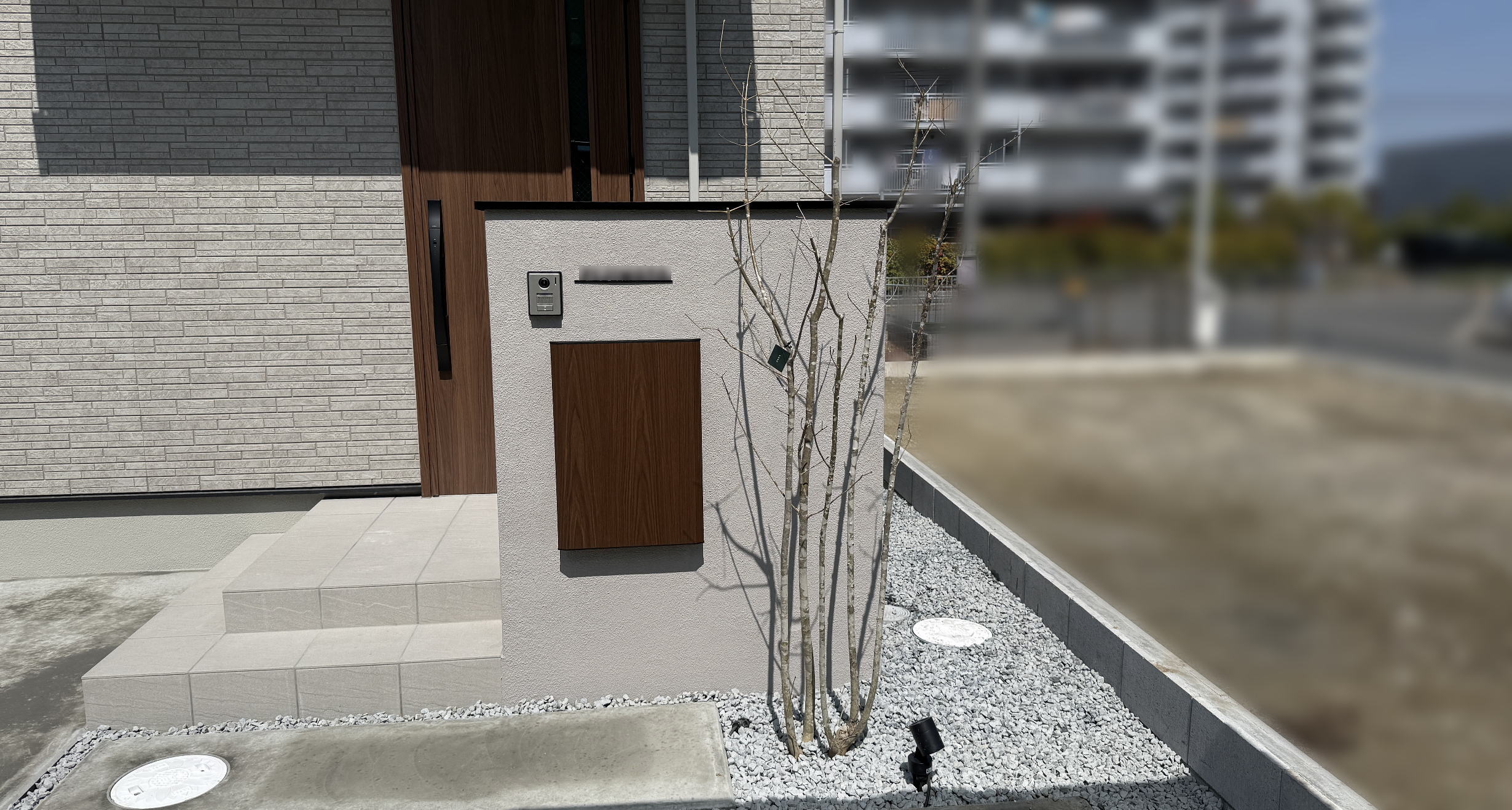 枚方市F様邸 アプローチ 門柱下地ブロック積み ユニソン ヴィコスマートDB 宅配ポストタイプ ポスト有/サテンブラック&ウォールナット 左開き前入れ後取り出し オプション:セサミタッチ枚方市F様邸 アプローチ 門柱下地ブロック積み