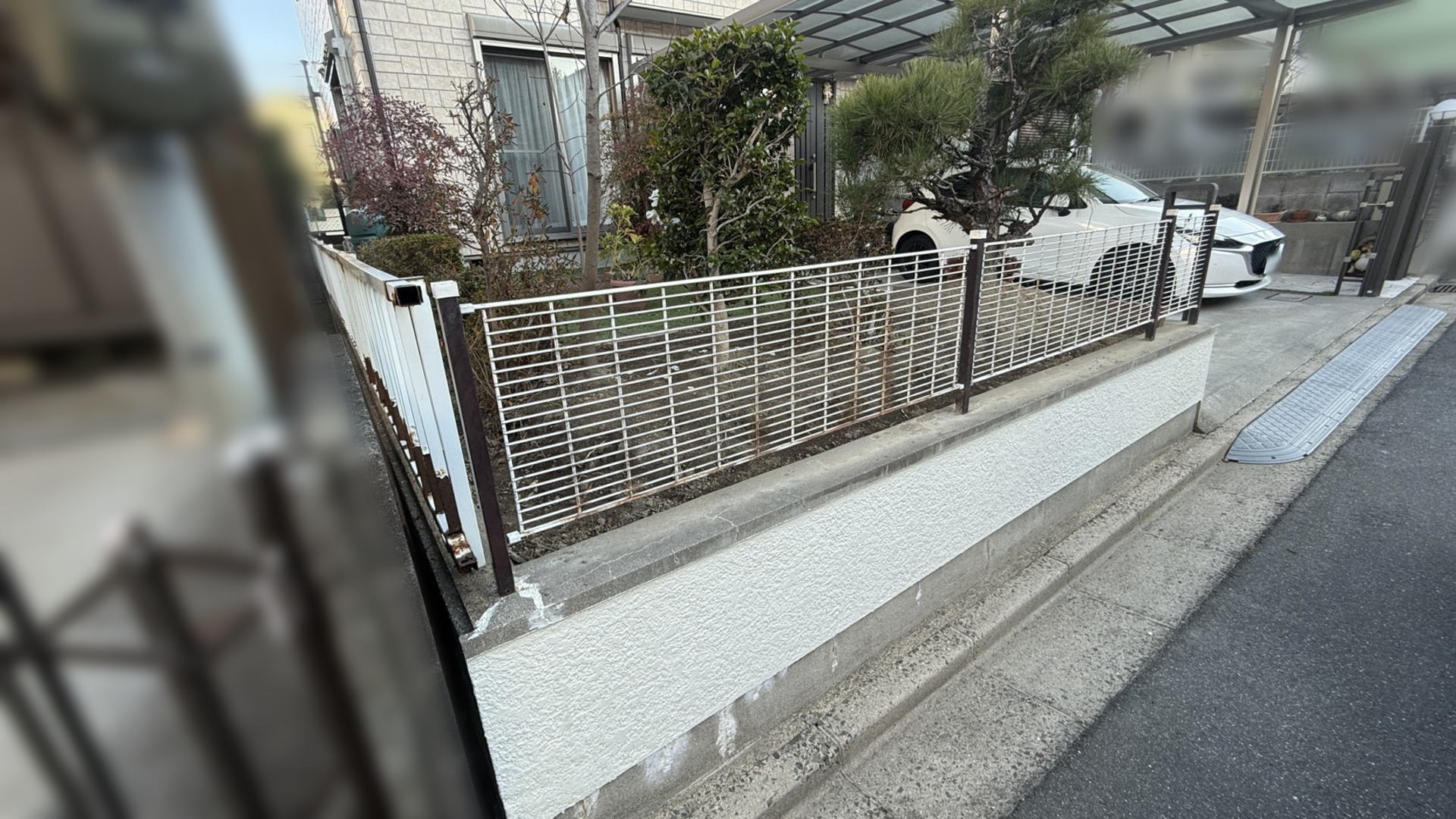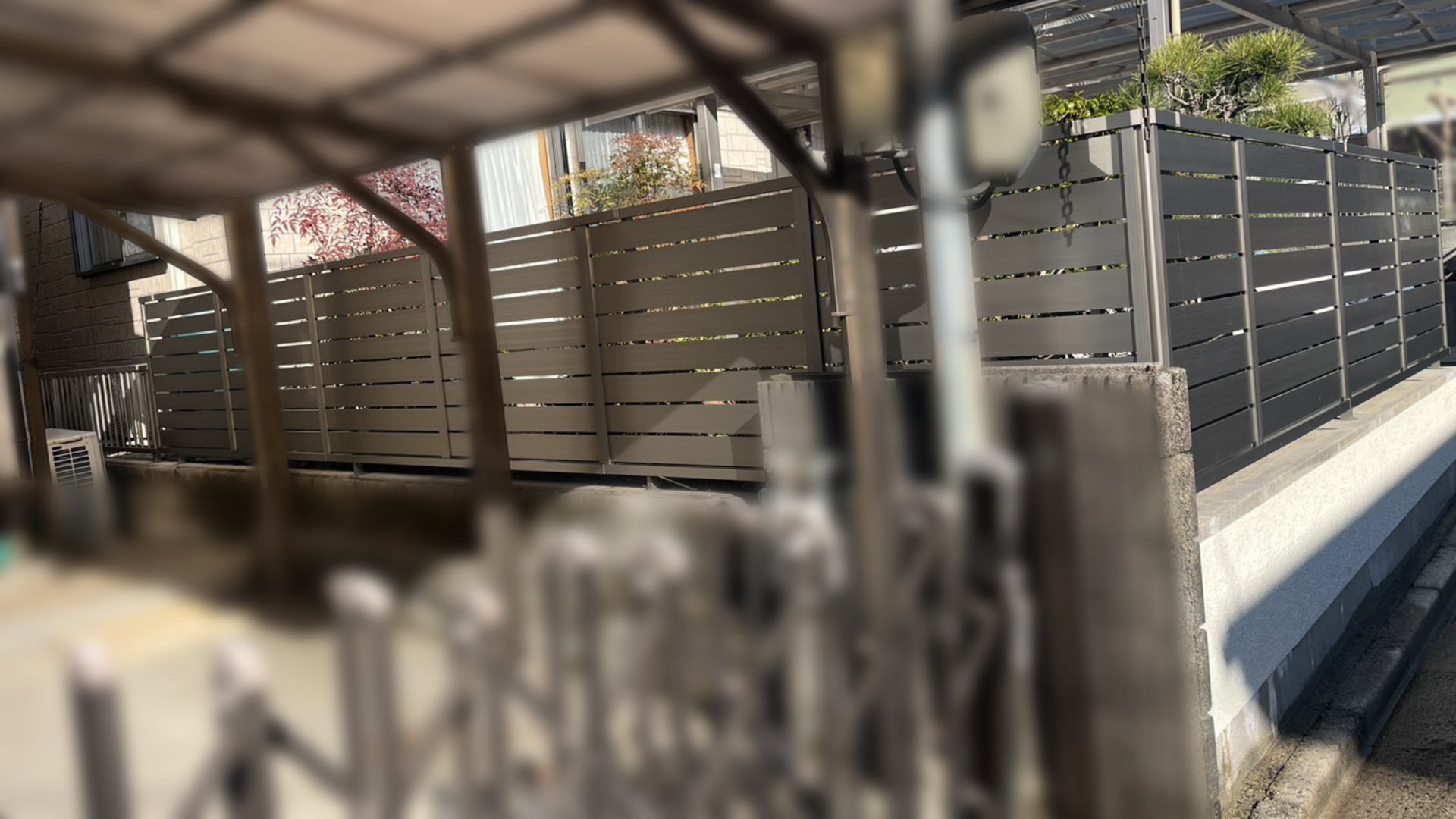 道路境界沿いと隣地境界沿いの前から6m分、前庭部分まで半目隠しフェンスを設置しました。