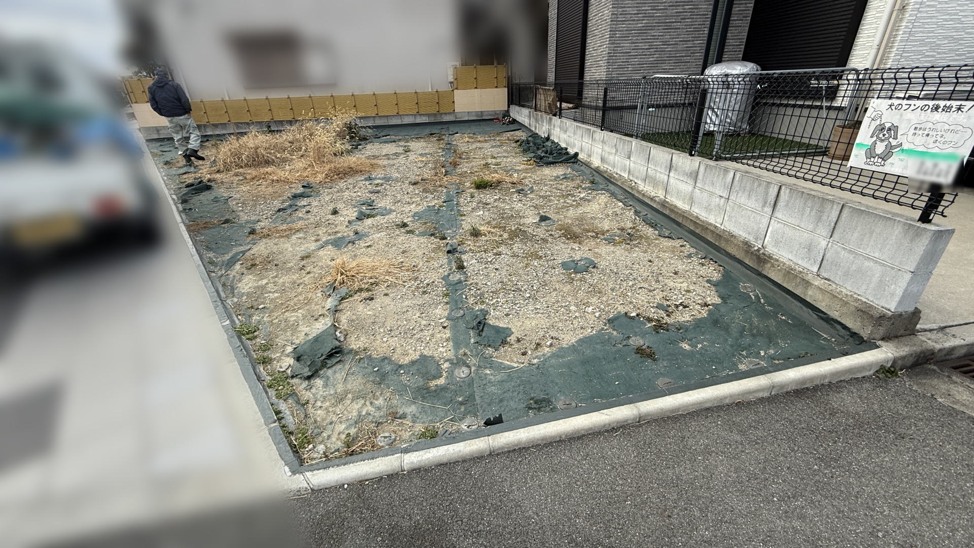 以前に防草工事を施工させていただいた高槻市K様所有地において、防草シートの経年劣化による破損が確認されたため、防草工事のやり替えを行いました。