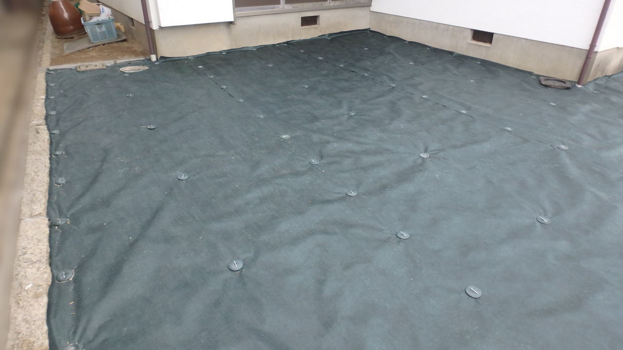 お庭の通路に防草シートを敷いてワッシャー・コの字ピンで止めました