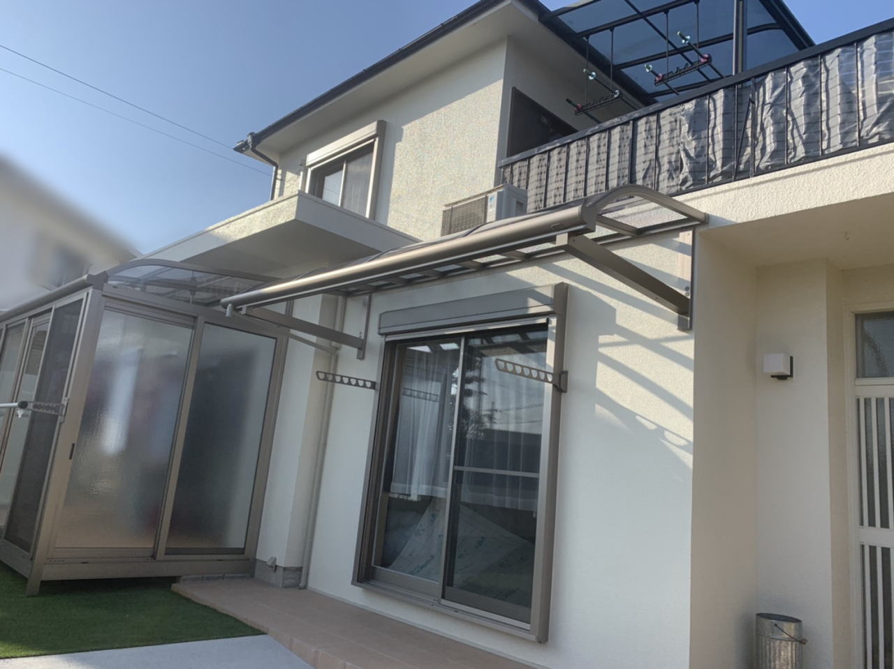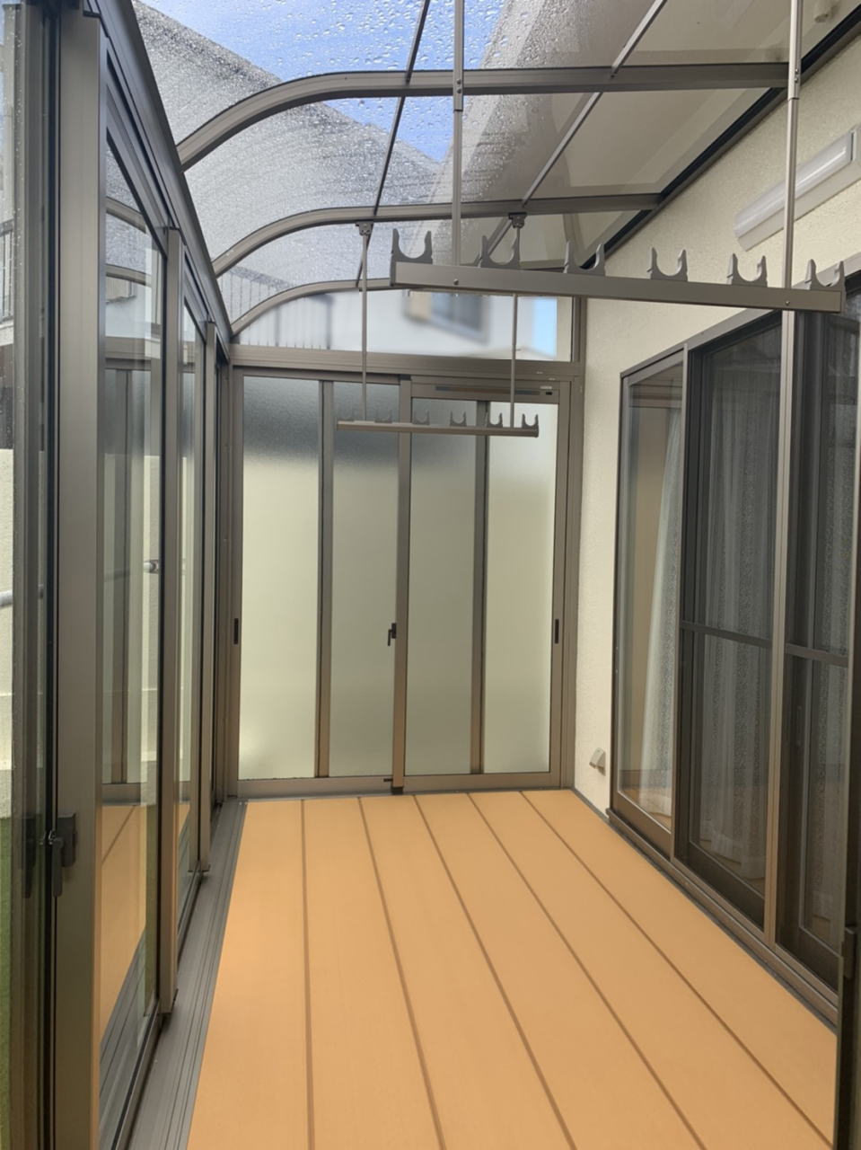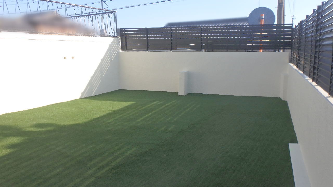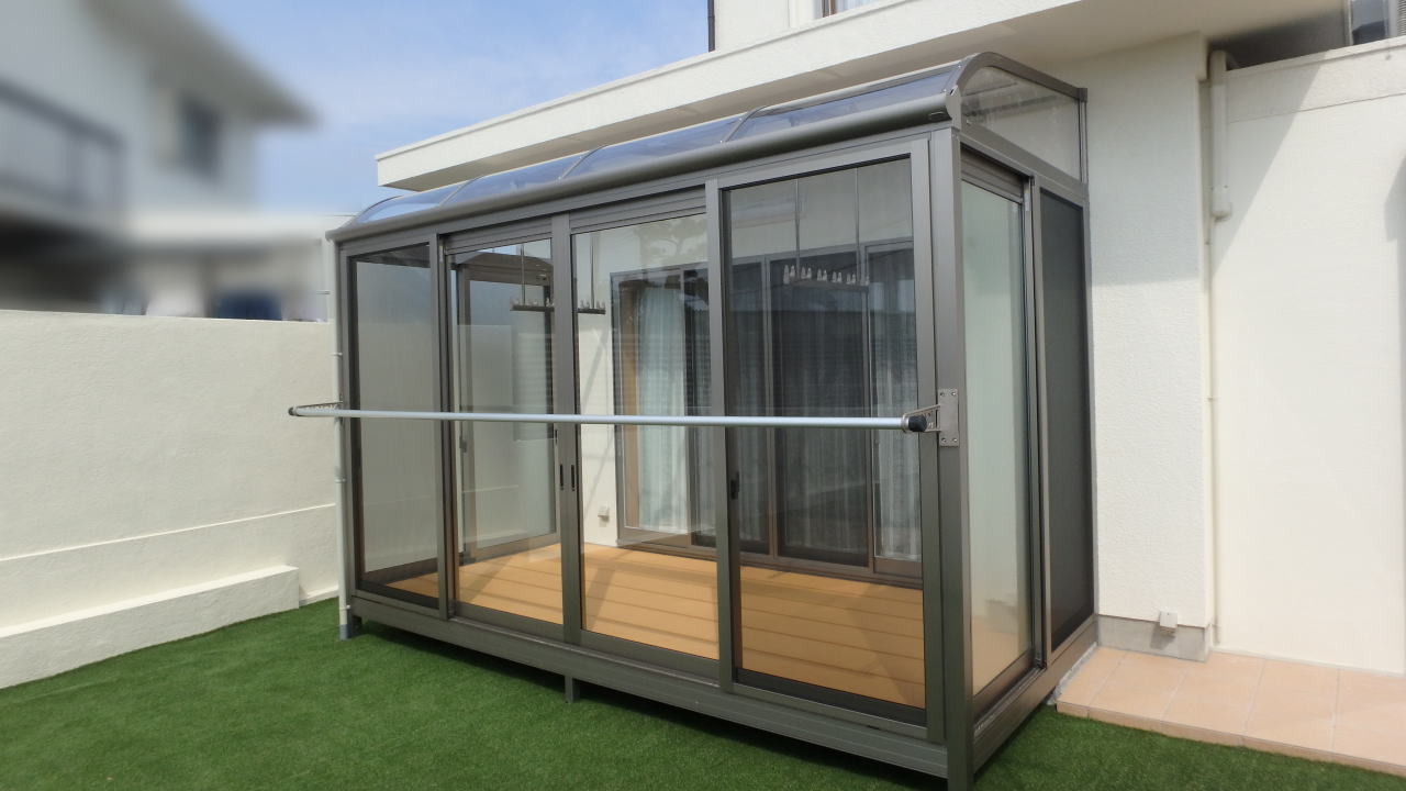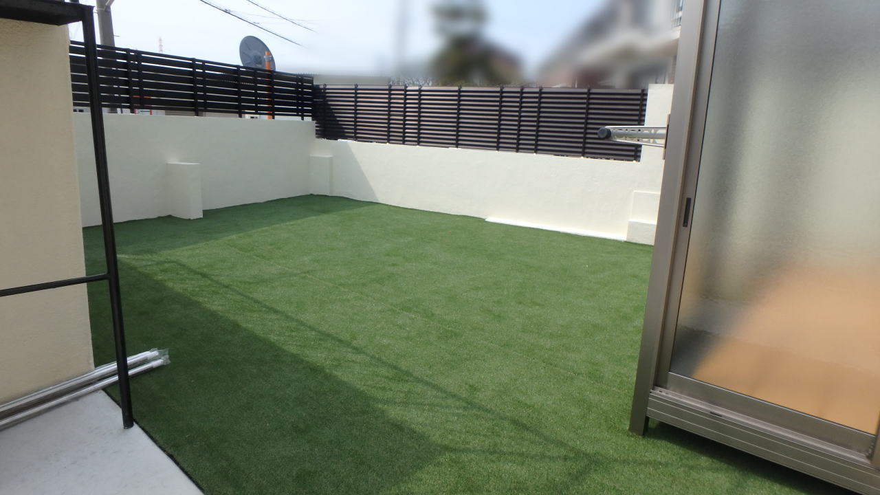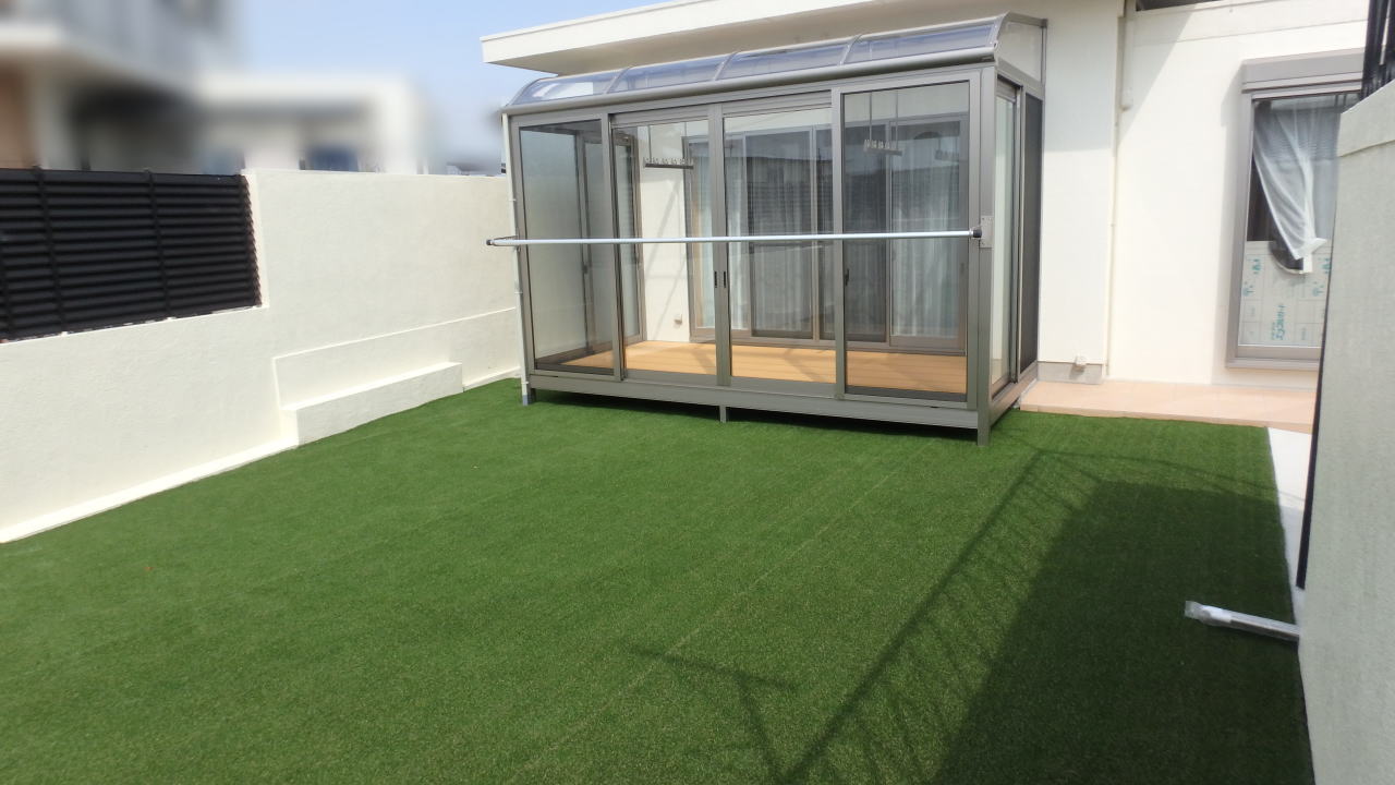 お庭の一部に人工芝を張り、掃き出し窓前に物干し場のサンルームを設置しました |