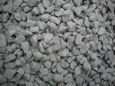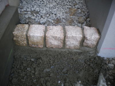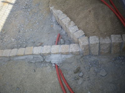 ガレージ奥の砕石の通路とガレージの土間コンクリートを仕切る為ピンコロを並べました |