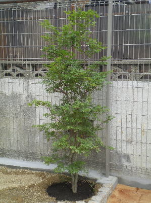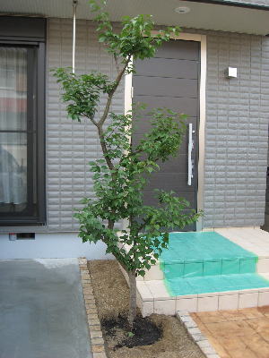 木を植え、バーク堆肥を混ぜた真砂土を入れ、水鉢を作って水をやりました |