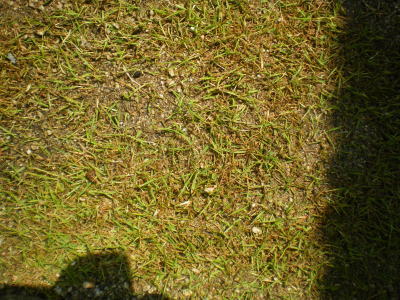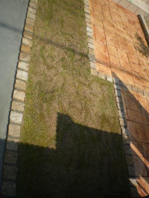 西側花壇に芝を張り、目地土をいれて水をやりました |