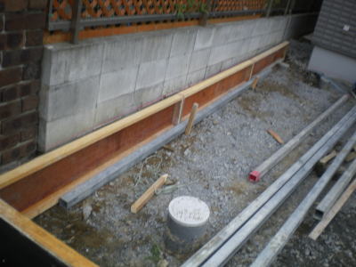 西側境界ブロックの補強に添えコンクリートを打設するため、鉄筋を入れて型枠を設置しました