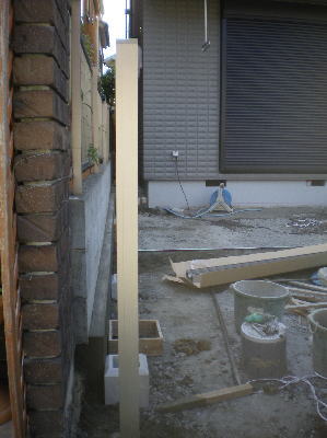 東西境界の独立基礎に柱を建て、フェンスを設置しました
