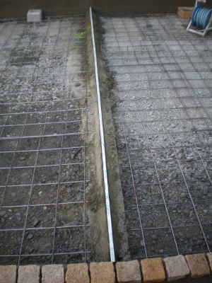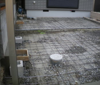 ガレージに砕石をいれ転圧をし、ワイヤーメッシュを敷きました |