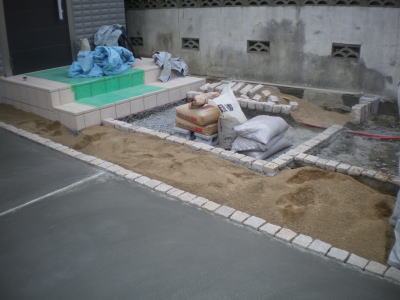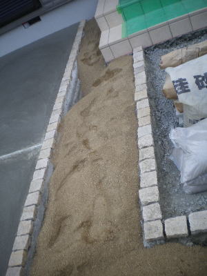 アプローチ・花壇の縁取りとしてピンコロを並べ、真砂土をいれました